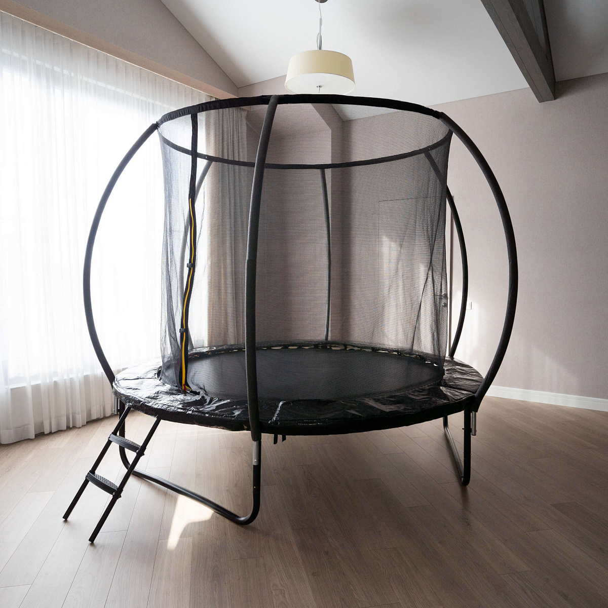Лестница оборудована пластиковыми ступенями, что предотвращает скольжение. Батут легко собирается и разбирается, что позволяет быстро установить его на дачном участке или игровой детской площадке, делает удобным для хранения и транспортировки.
