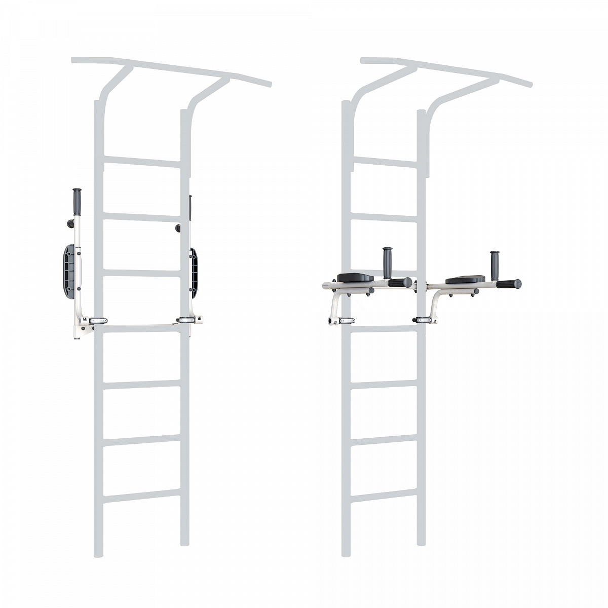 Брусья откидные подойдут пользователям, которые любят рациональность и экономию пространства. После упражнений они откидываются в вертикальное положение и не мешают занятиям на другом навесном оборудовании и не занимают место в помещении. Брусья снабжены четырьмя прорезиненными рукоятями и подлокотниками.