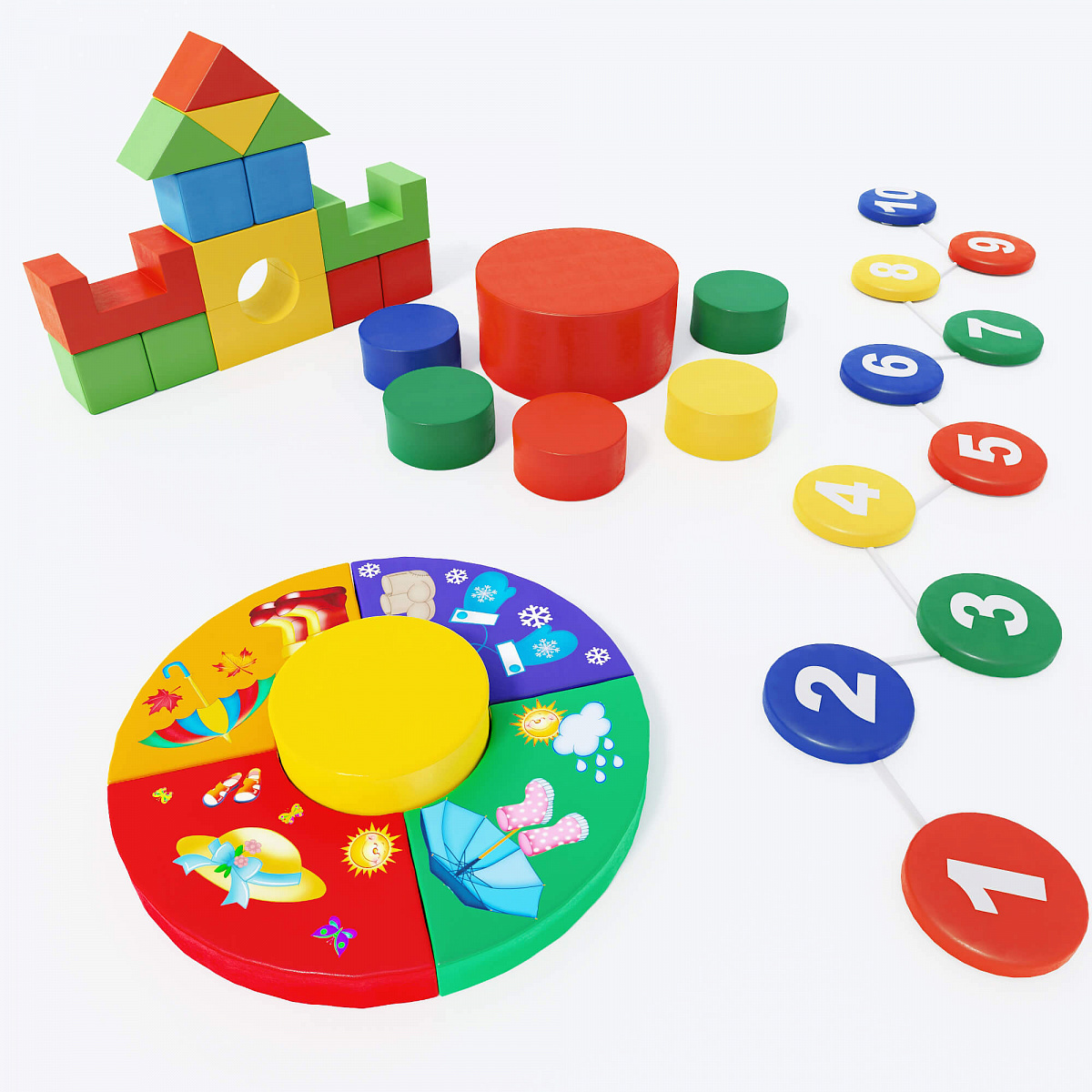 Набор мягких игровых комплексов предназначен для организации детского досуга в игровых комнатах, залах лечебной физкультуры и детских садах. Мягкие модули, входящие в состав набора подойдут для комплексного физического и умственного развития детей разных возрастов. Элементы комплекса можно использовать в качестве строительных блоков для сооружения различных конструкций, а также в качестве элементов полос препятствий при организации соревновательных мероприятий. Дидактический модуль «Времена года», входящий в состав набора, формирует у детей представление об окружающем мире, способствует развитию внимательности, памяти, логического и образного мышления. Модуль «Шагайка» обучает основам счета и развивает координацию в пространстве.